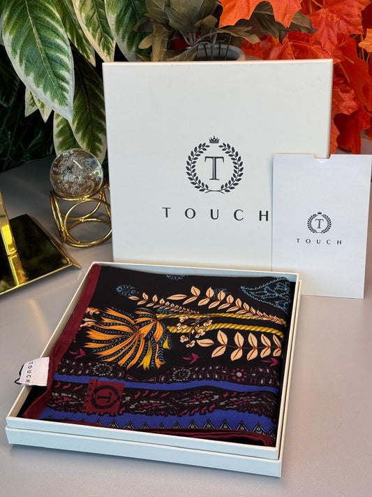 Touch İthal Etnik Desen Yün İpek Şal- Mürdüm-Siyah