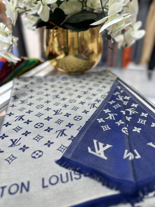 Lv Desenli İpek Kaşmir Çift Taraflı Şal - Vizon/ Lacivert