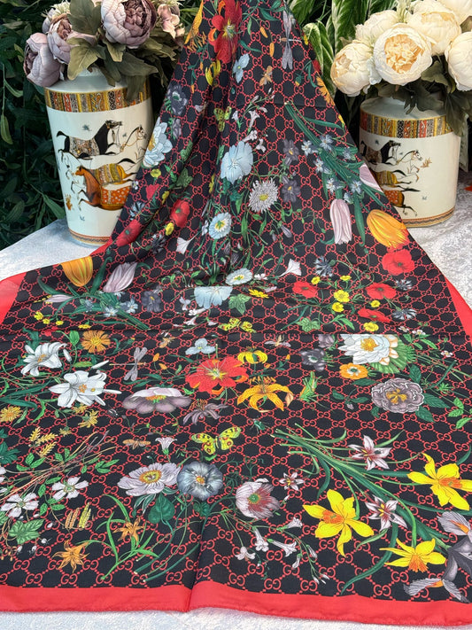 Gucci Çiçek Desen Pamuk Soft Şal 65355 - Siyah/Kırmızı
