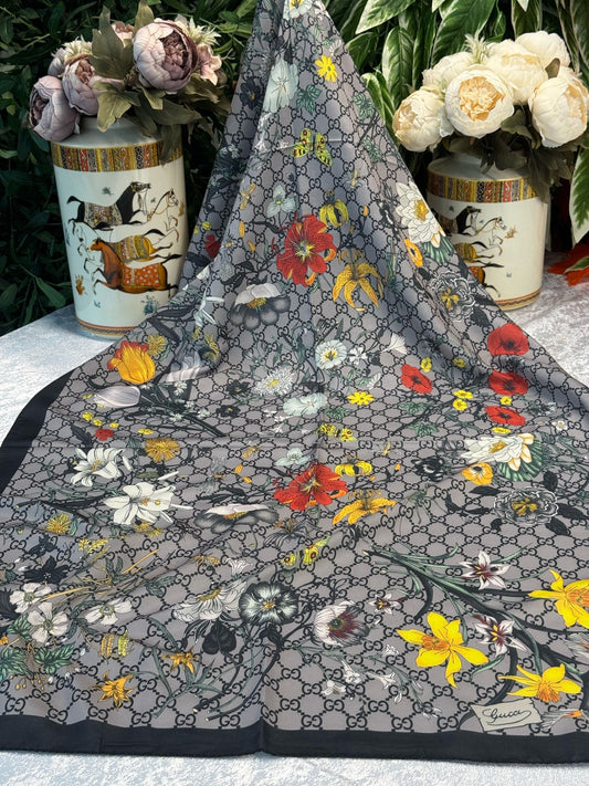 Gucci Çiçek Desen Pamuk Soft Şal 65355 - Gri/Siyah