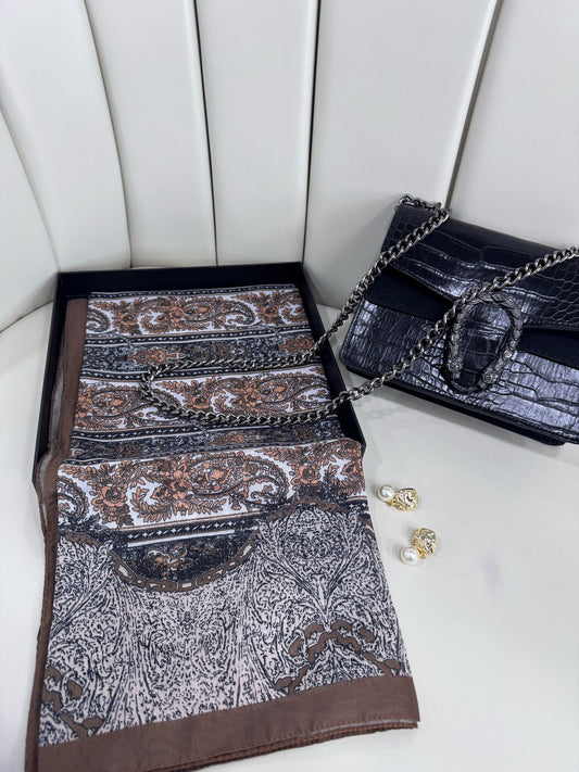 Retro Desen Pamuk İpeksi Eşarp -125698- Çikolata