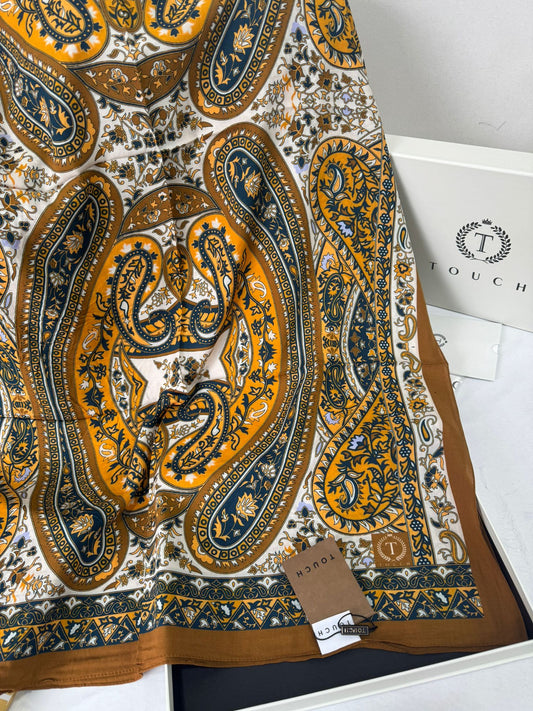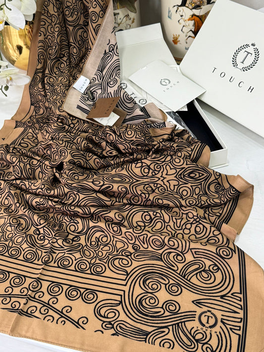 Touch İthal Etnik Desen Pamuk İpek Şal- 35440 - Kahve Ekru