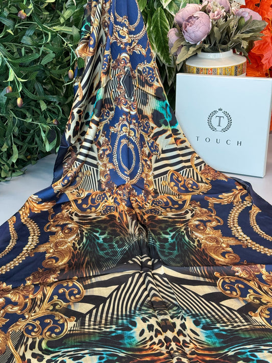 Touch İthal Etnik Leopar Vual İpek Şal - 887780 - Lacivert Gold
