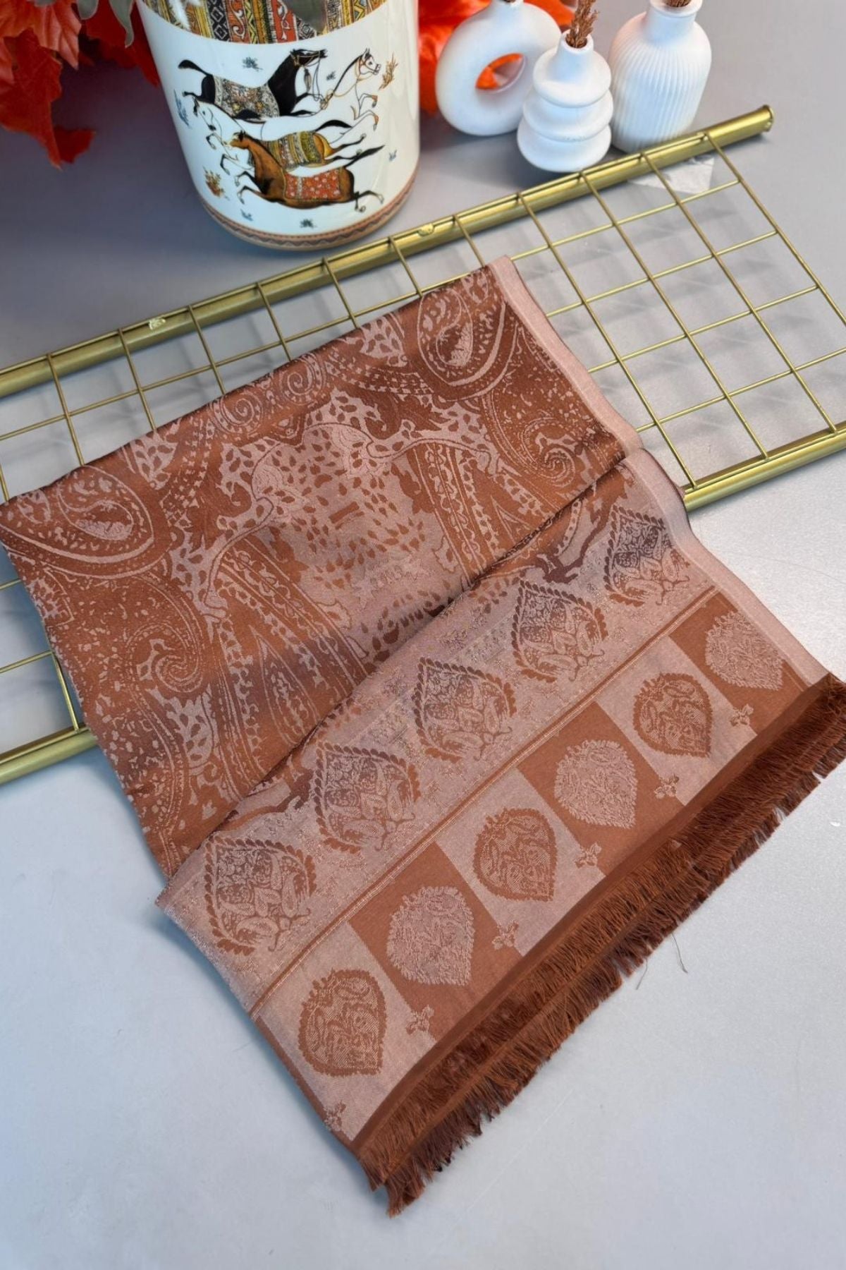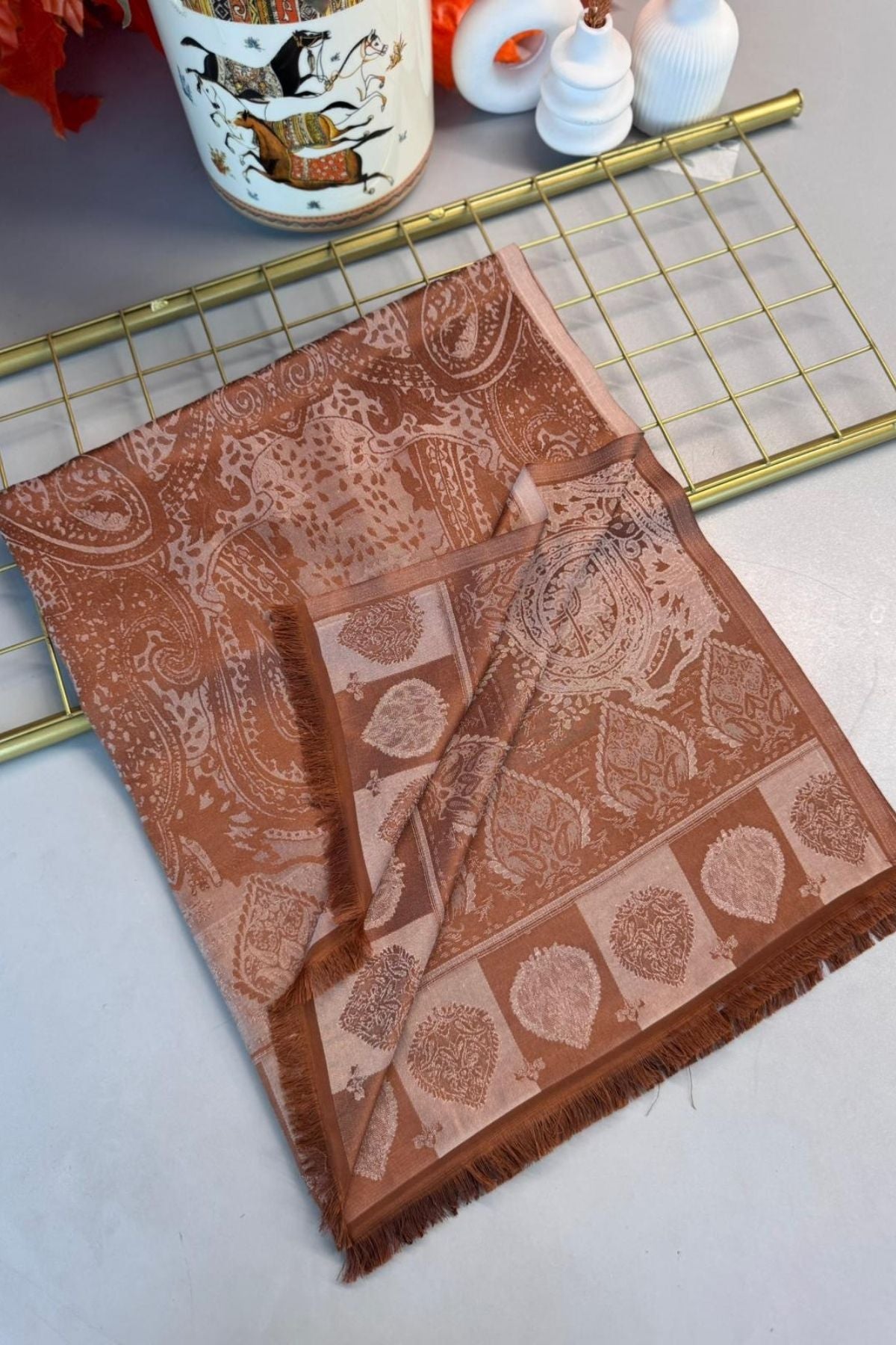 Bella Kendinden Dokulu Çift Taraflı İpek Şal - 4598 - Kahve