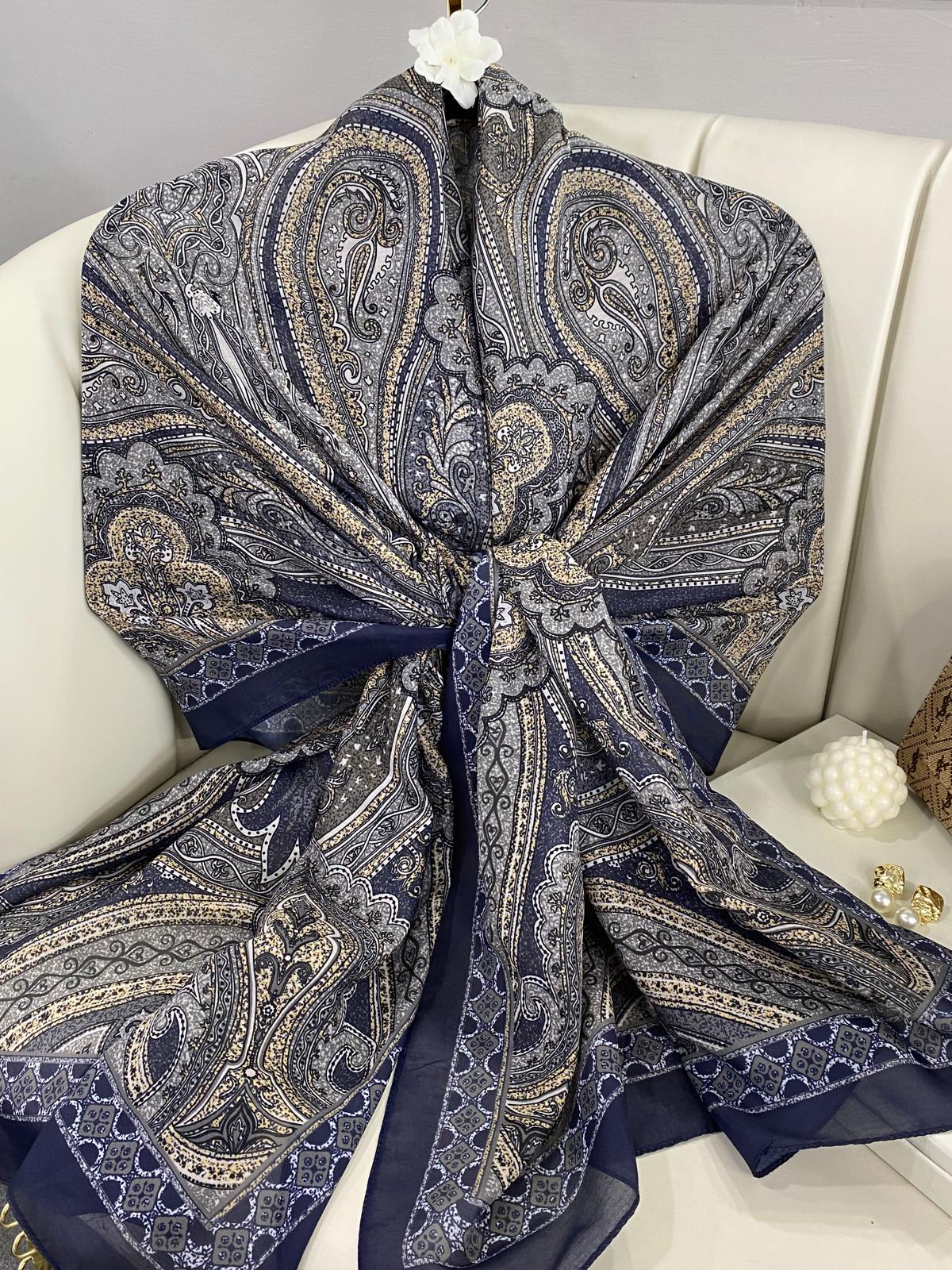 Çini Desen Pamuk İpek Şal - 7458- DUMANLI MAVİ