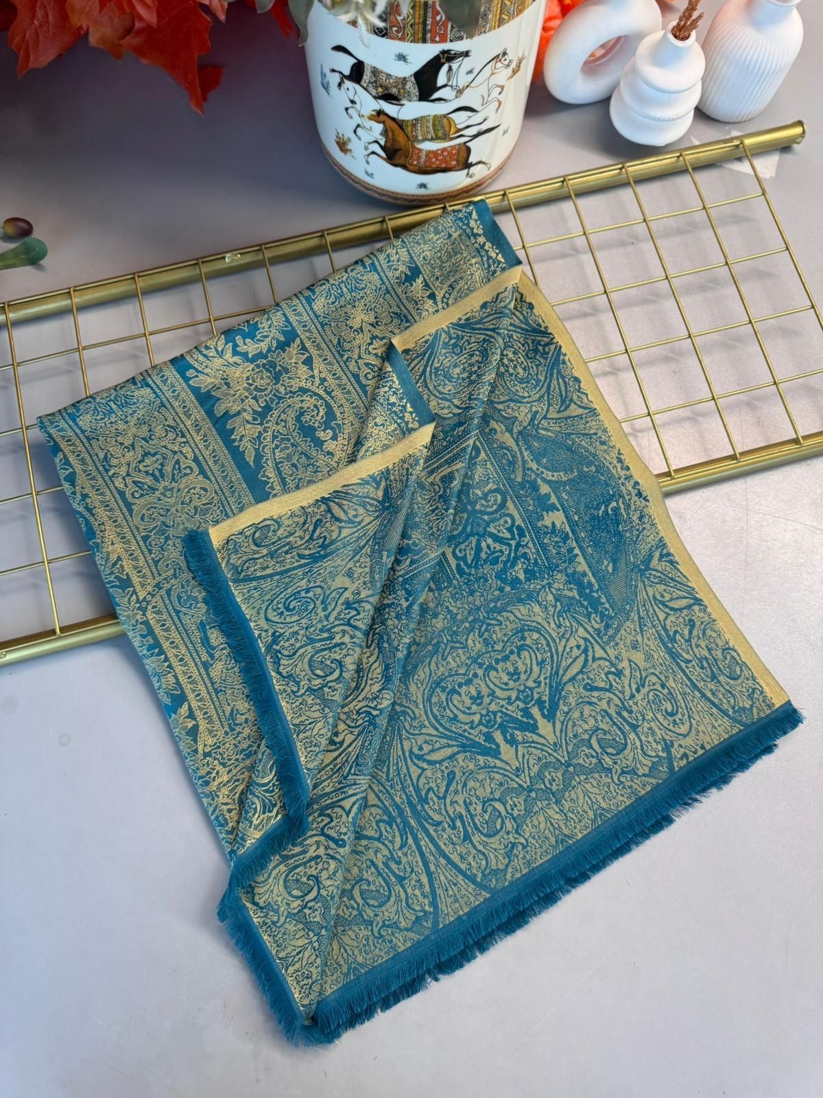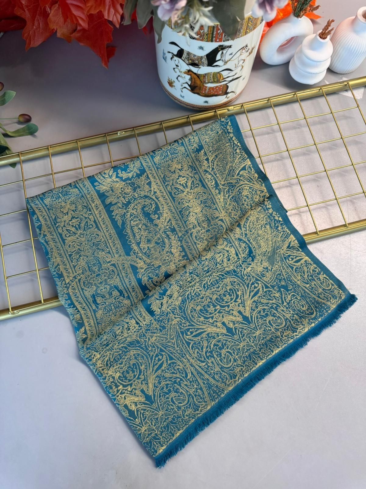 Liva Kendinden Dokulu Çift Taraflı İpek Şal - 9897 - Petrol