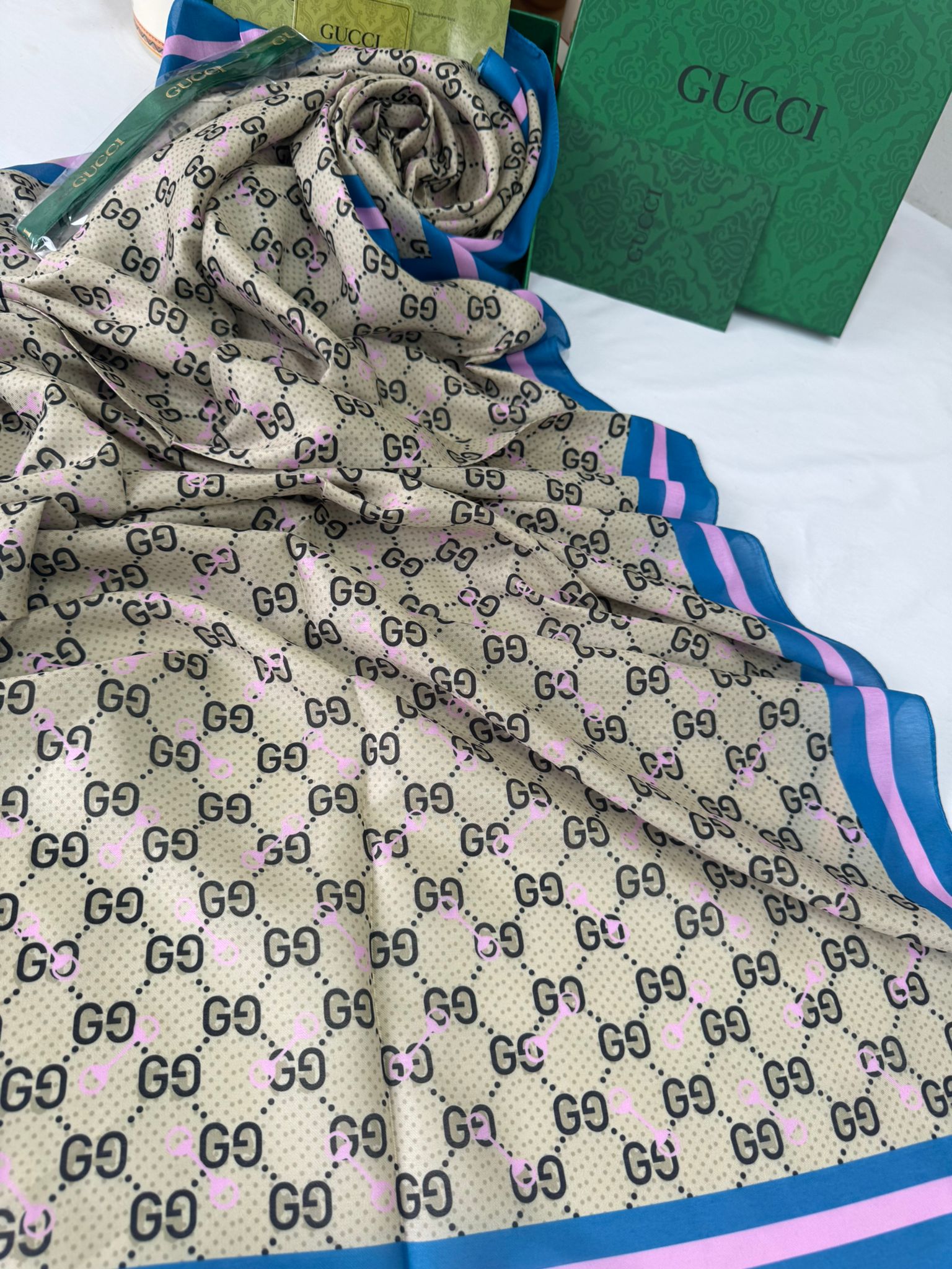 NEW GUCCİ Desen Pamuk İpek Şal-64750- Bebe Mavisi