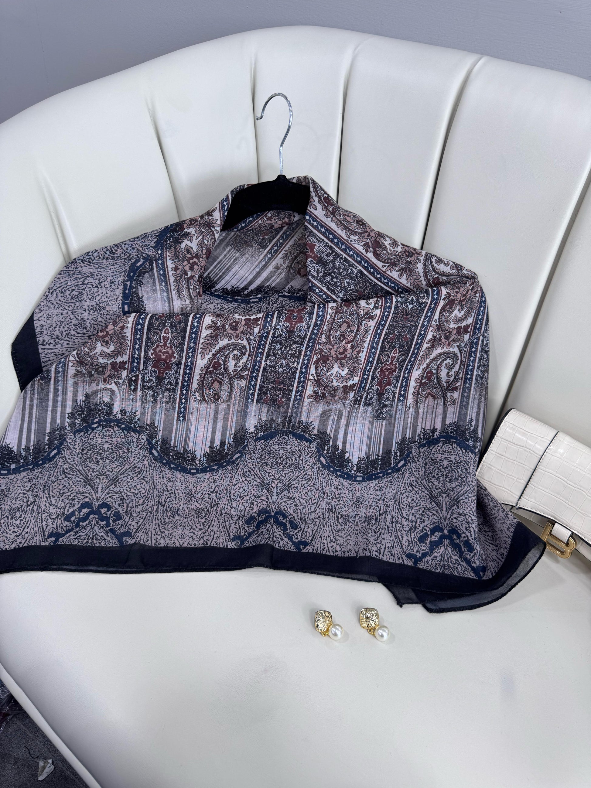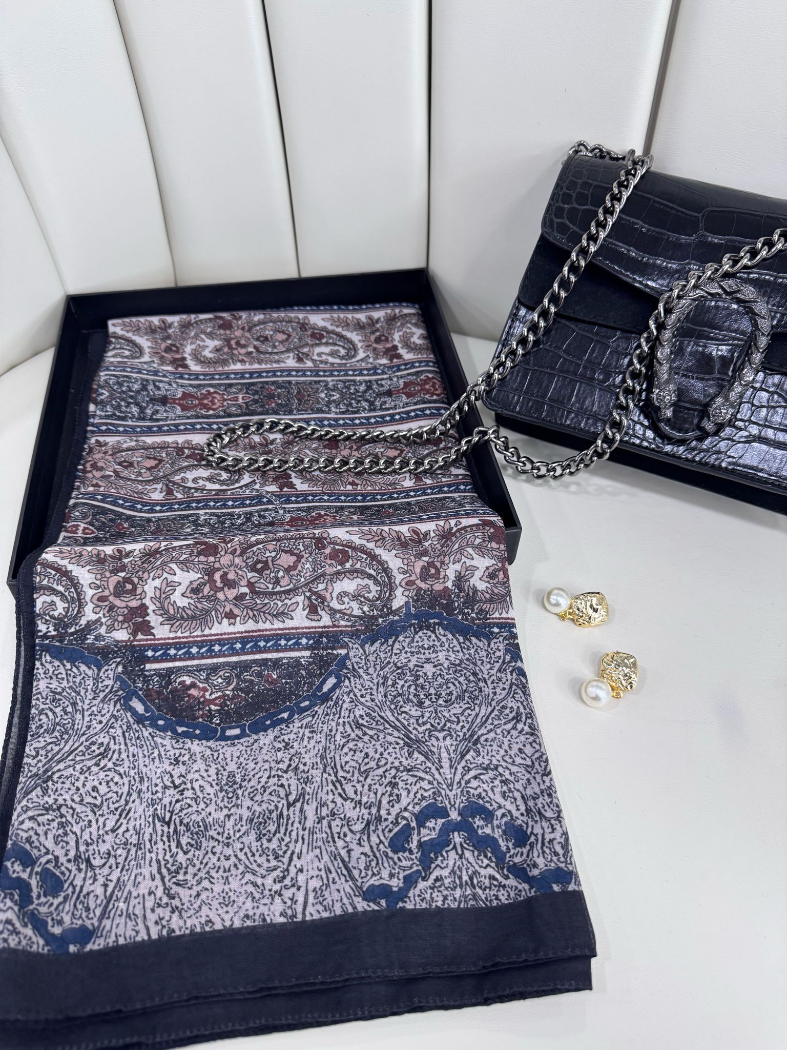 Retro Desen Pamuk İpeksi Eşarp -125698- Buz Mavisi