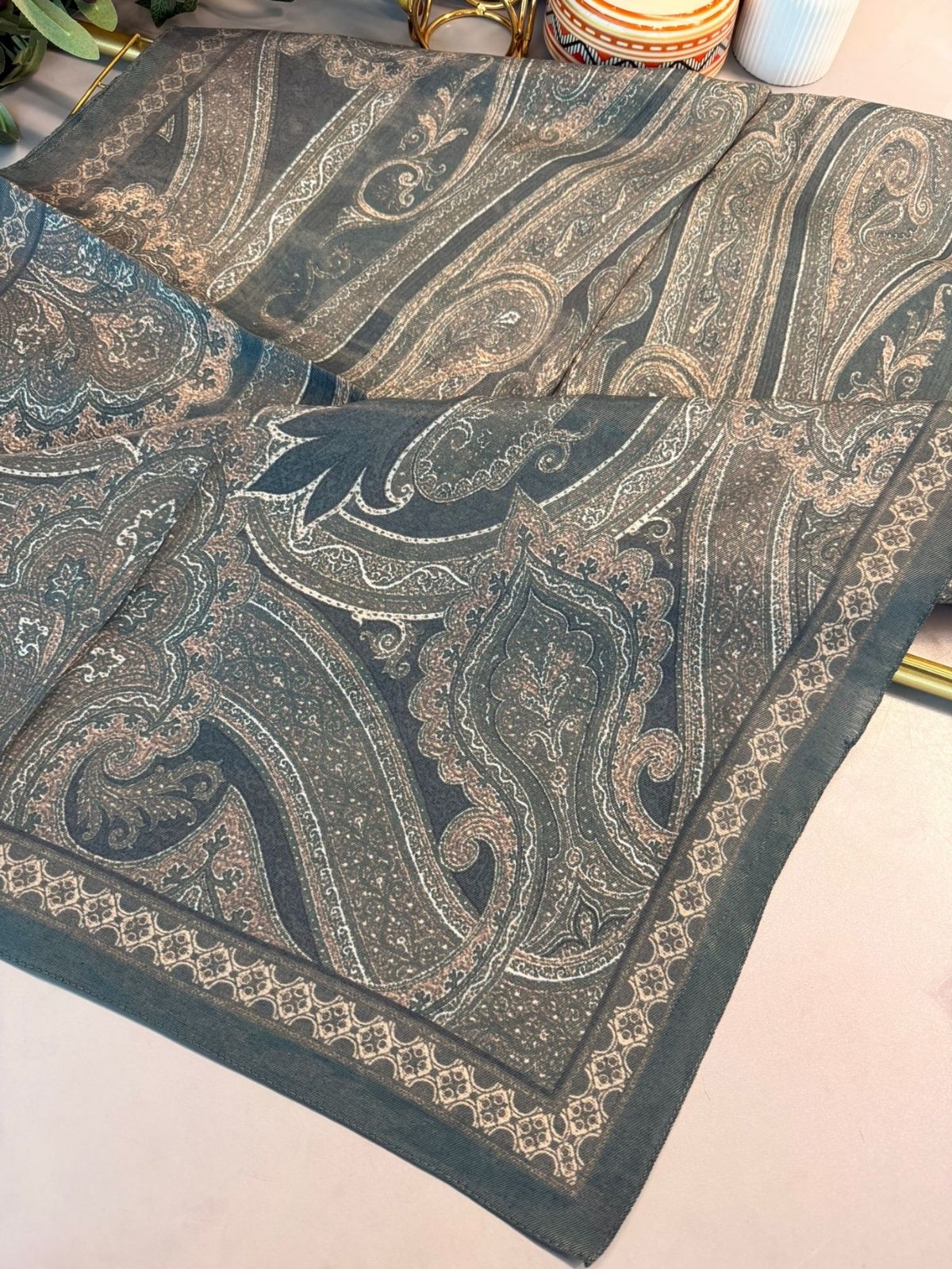 Geleneksel motiflerin modern bir estetikle buluştuğu göz alıcı bir tasarıma sahiptir. Karmaşık ve simetrik desenler, klasik bir hava yaratırken, akıcı çizgiler ve detaylı işlemeler ürüne derinlik katmaktadır. Dikey olarak uzanan bu desen kurgusu, şalın her iki ucunda da kendini göstererek bütünlüklü bir görünüm sunar. Yumuşak dokusu ve asil duruşuyla, özel günlerinizde veya günlük şıklığınızda sofistike bir tamamlayıcı olacaktır.
