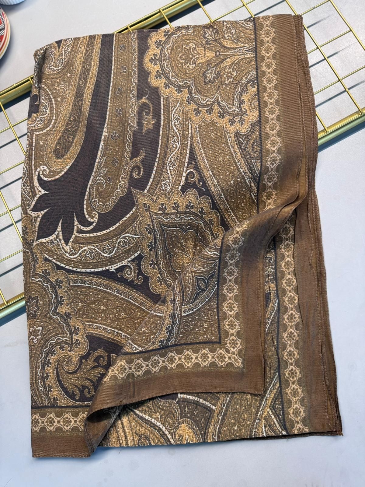 Karmaşık ve simetrik desenler, klasik bir hava yaratırken, akıcı çizgiler ve detaylı işlemeler ürüne derinlik katmaktadır. Dikey olarak uzanan bu desen kurgusu, şalın her iki ucunda da kendini göstererek bütünlüklü bir görünüm sunar. Yumuşak dokusu ve asil duruşuyla, özel günlerinizde veya günlük şıklığınızda sofistike bir tamamlayıcı olacaktır. Kumaş : Yün İpek Şal