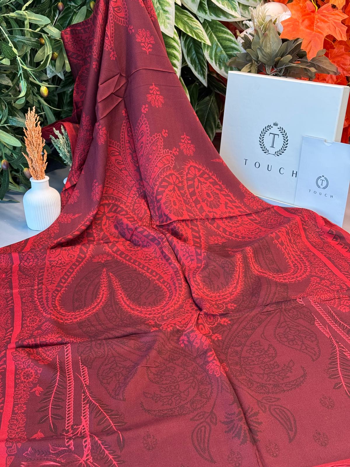 Touch İthal Etnik Desen Yün İpek Şal - Koyu Kırmızı