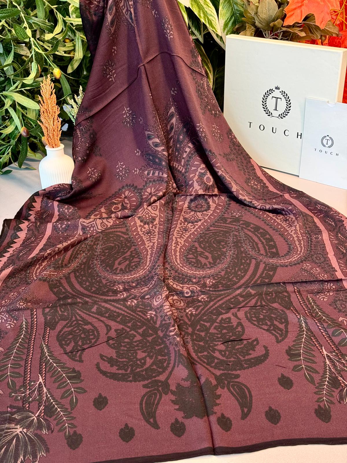 Touch İthal Etnik Desen Yün İpek Şal - Siyah-Koyu Gül Kurusu